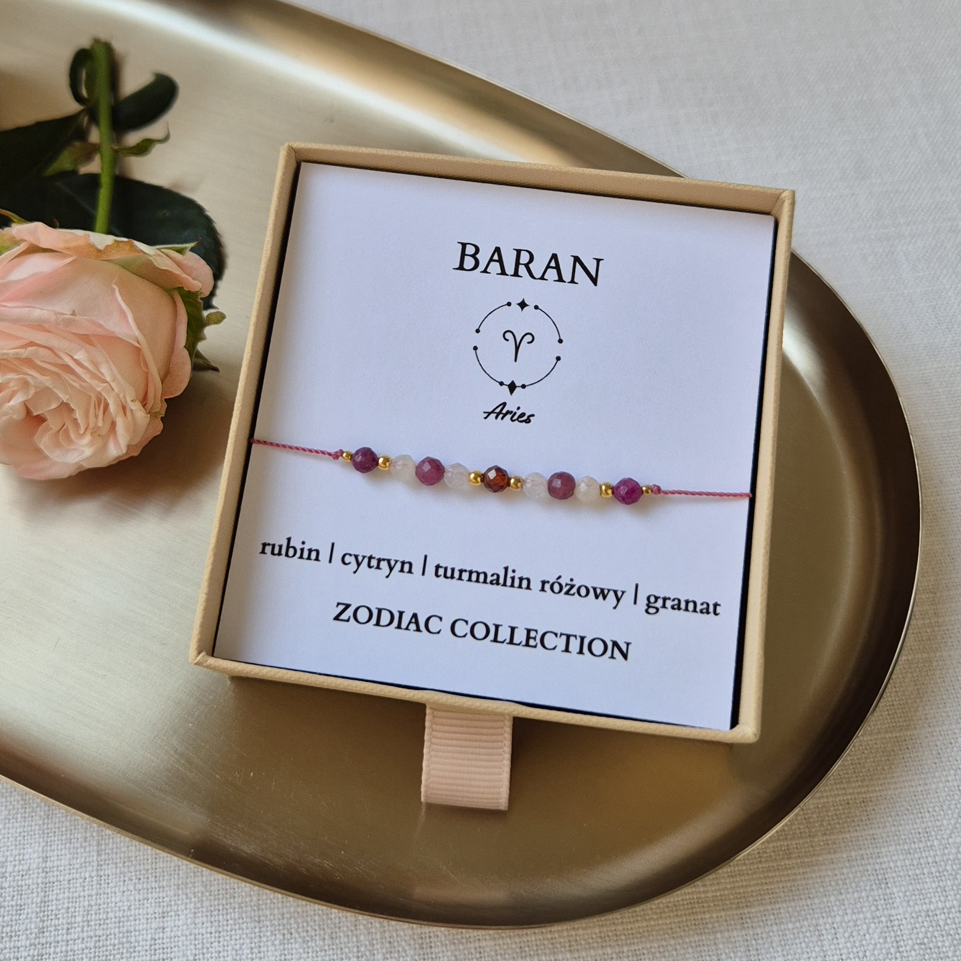 Bransoletka zodiakalna BARAN to ręcznie wykonana biżuteria z naturalnych kamieni – rubinu, cytrynu, turmalinu różowego i granatu. Ta dynamiczna kompozycja wspiera odwagę, siłę wewnętrzną i autentyczność – cechy, które idealnie odzwierciedlają energiczny i niezależny charakter Barana.