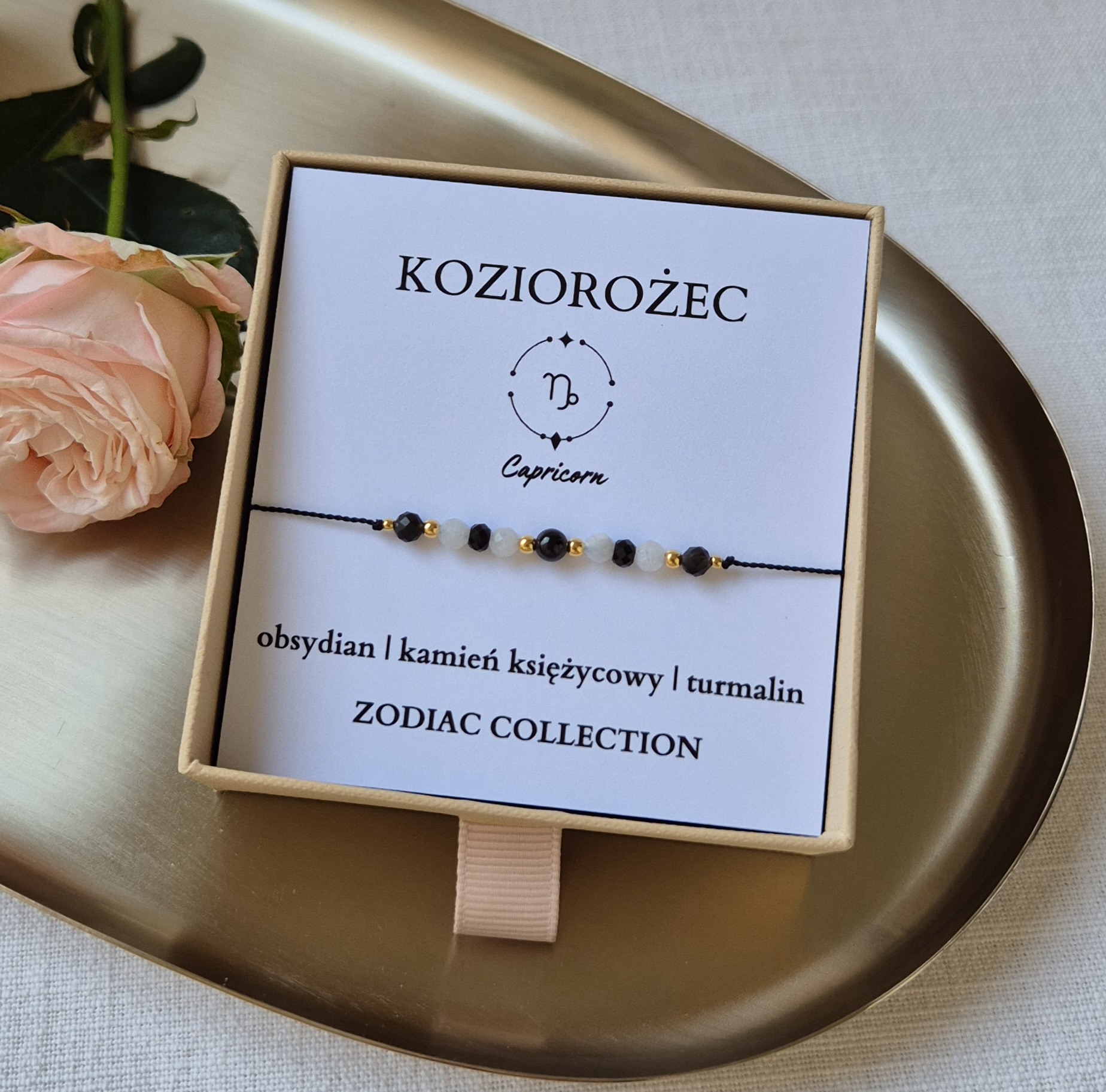 Bransoletka zodiakalna KOZIOROŻEC – obsydian, kamień księżycowy, turmalin