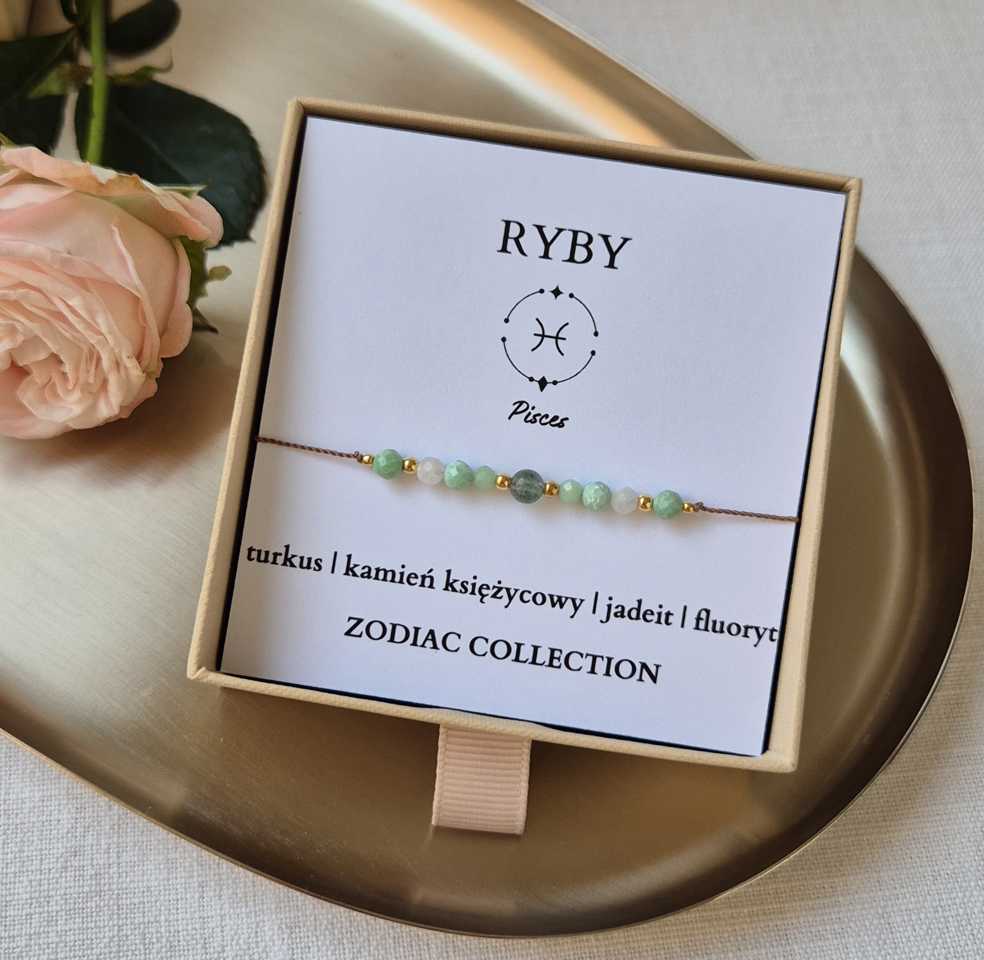 Bransoletka zodiakalna RYBY to ręcznie wykonana biżuteria z naturalnych kamieni – turkusu, kamienia księżycowego, jadeitu i fluorytu. Ta subtelna kompozycja wspiera kreatywność, intuicję i wewnętrzną harmonię – cechy, które idealnie oddają emocjonalną i twórczą wrażliwość Ryb.