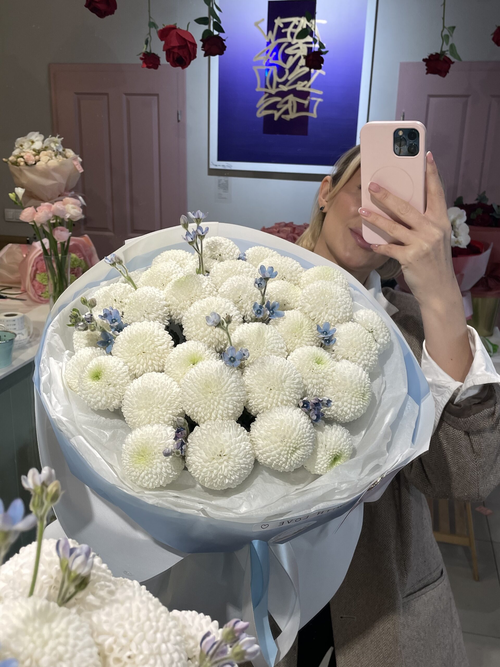 Bukiet w białym kolorze z niebieskim dodatkiem – elegancja w stonowanych barwach.