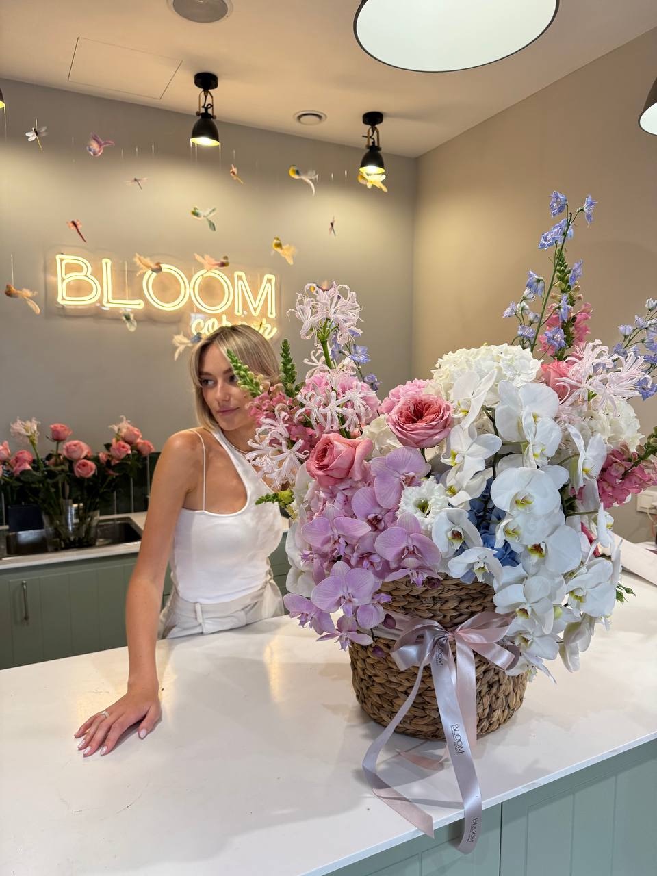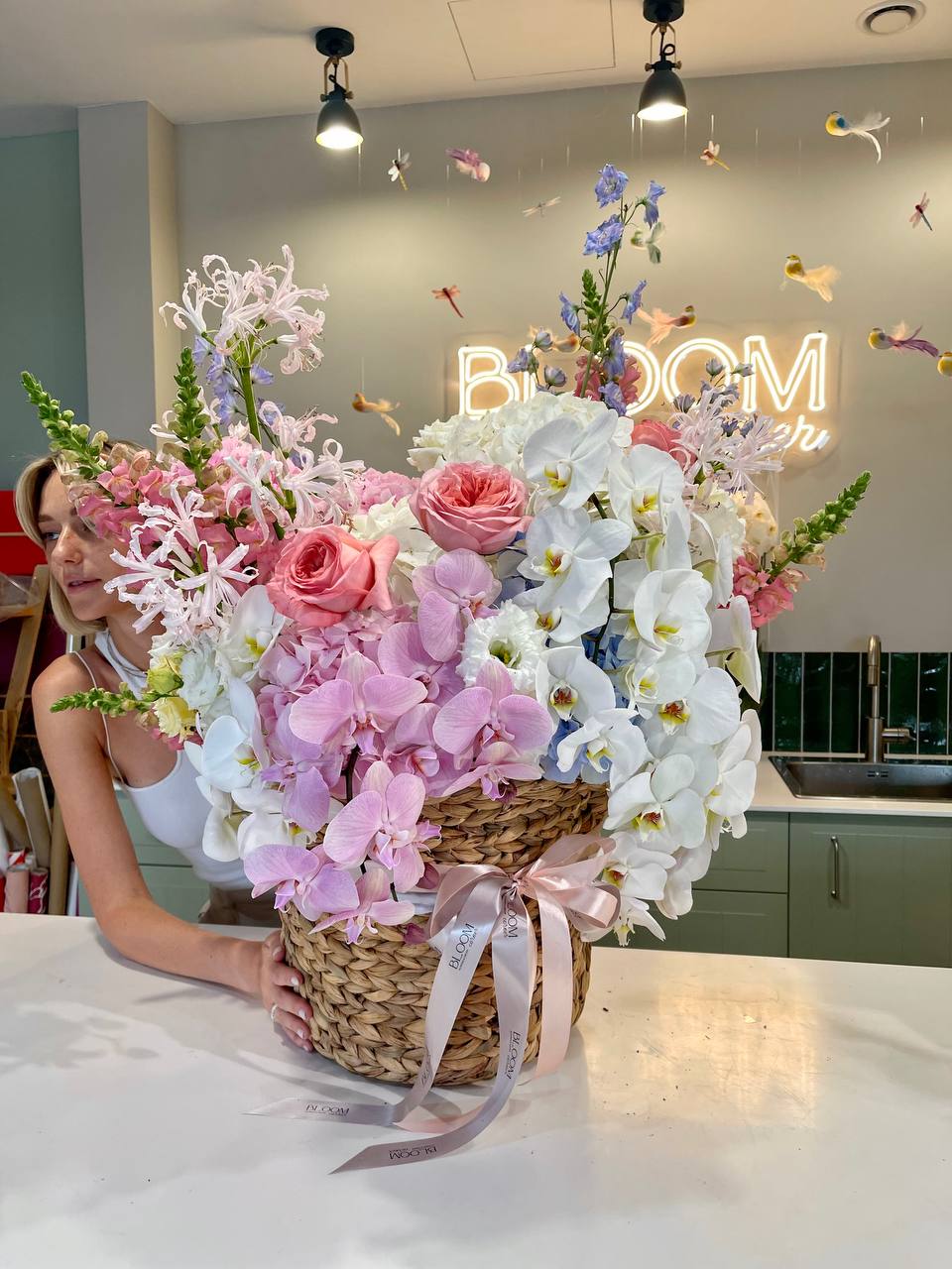 Duży kosz kwiatowy z mixem kwiatów i storczykiem – wyjątkowa kompozycja premium
