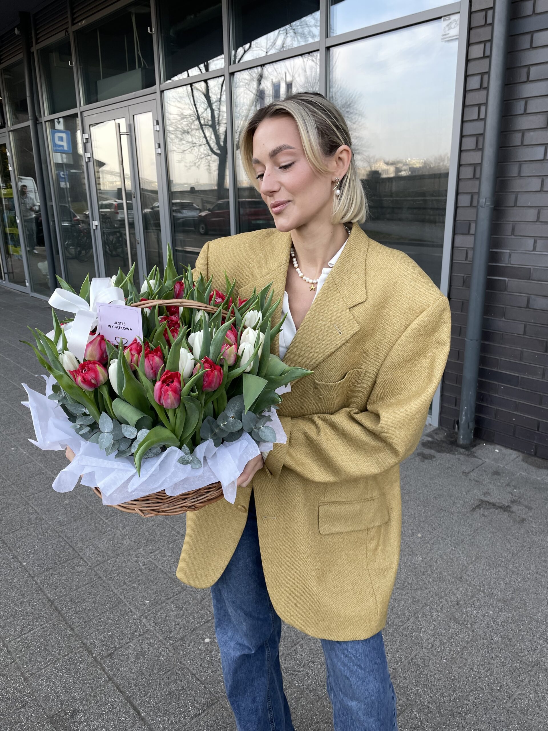 Tulipany symbolizują radość, świeżość i nowe początki, dlatego taki kosz kwiatów zawsze robi wrażenie i wywołuje uśmiech.