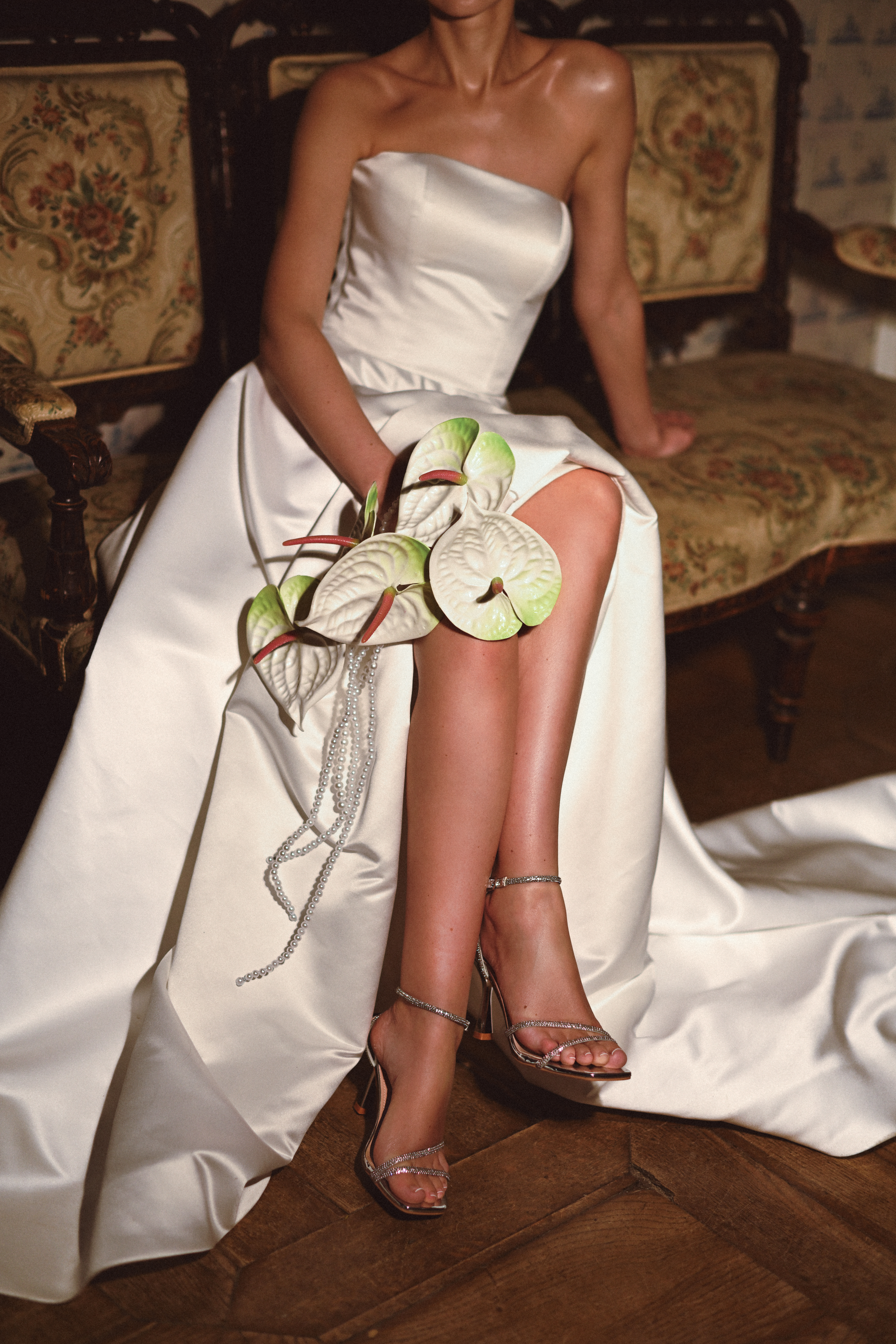 Wiszący bukiet z anturium na perłowych nici świetnie pasuje do stylizacji: